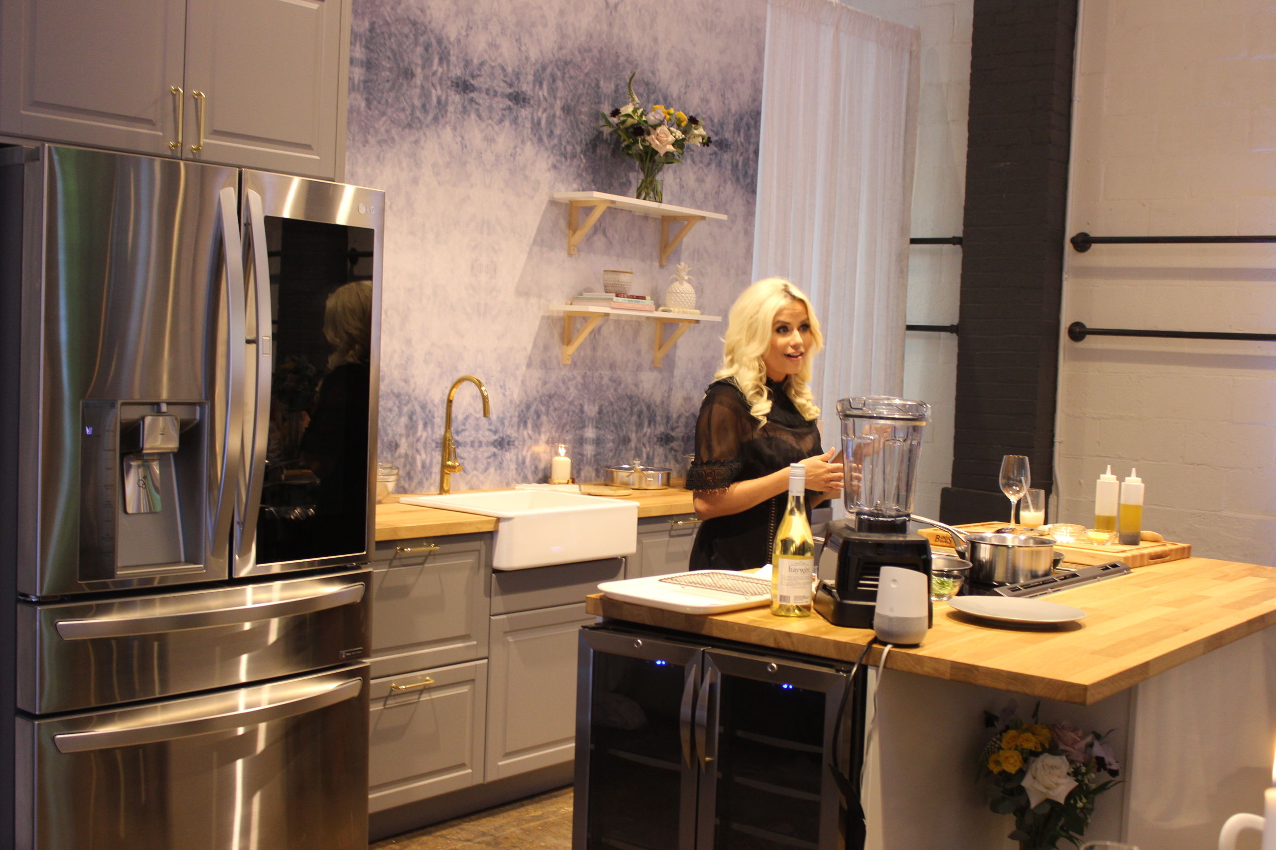 An empty storefront was transformed into a longtable dining room, with decor mimicking the romantic summer floral you might see in a wedding or a fine dining patio. A stylish state of the art smart kitchen, full of new LG, KitchenAid, and Vitamix appliances was designed by Aly Armstrong, designer extraordinaire. At the beginning of the evening, Aly provided us with her secrets to creating a stylish kitchen such as by adding pops of colour using countertop appliances which now come in various colours thanks to companies like KitchenAid.