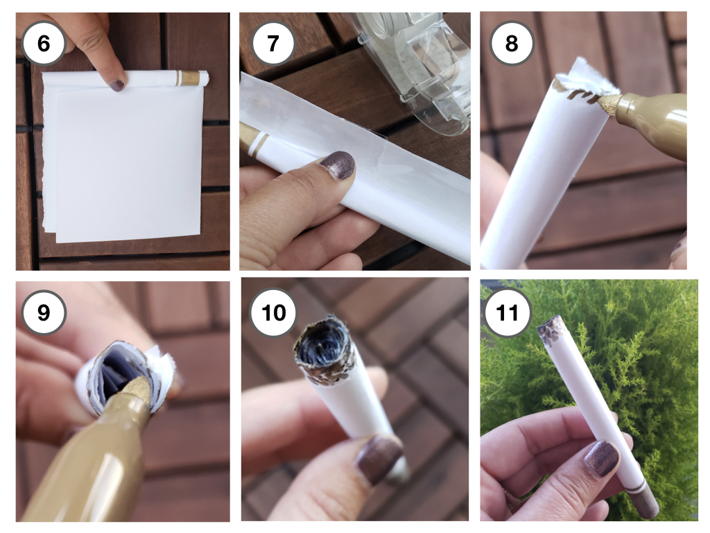 - Fake cigarette (see picture #1-11 below): Made by rolling a piece of white paper, taping the ends to secure the roll, painting the “burning” end with gold, silver, and a black sharpie for a burning cigarette effect, and painting the other end with a gold sharpie.