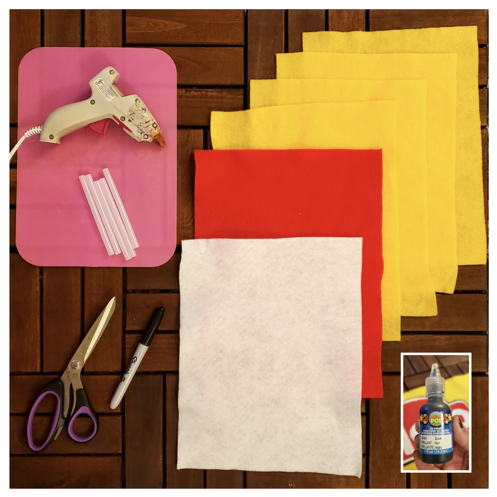 - A few sheets of yellow felt: The number of felt sheets you need will depend on your waist size so measure your stomach and waist area before buying the yellow felt. These can be found at a dollar store. I bought 4 sheets.
