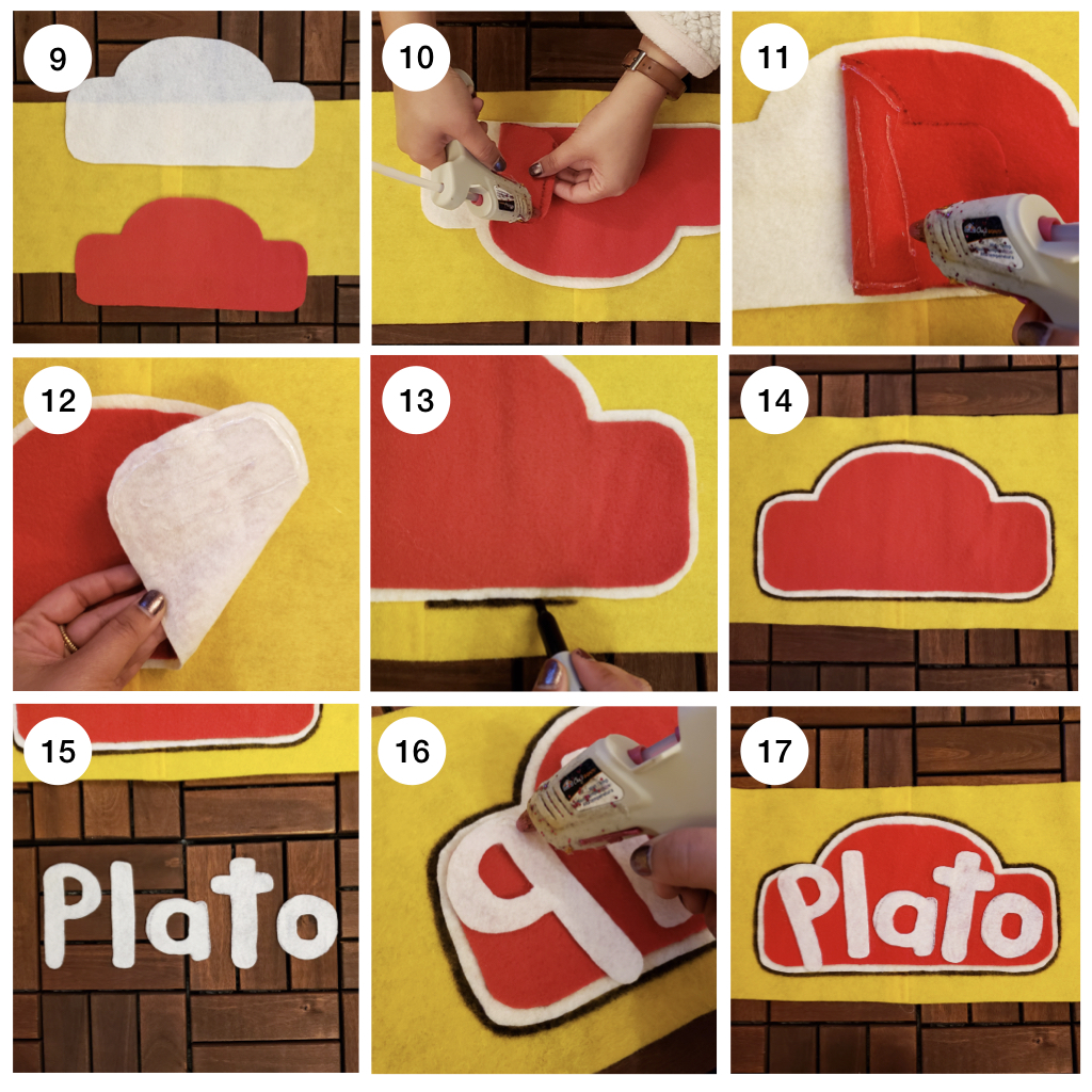 - Draw a P, L, A, T, and O with a sharpie on a white felt. Make fat letters like Play-Doh letters. Cut them.