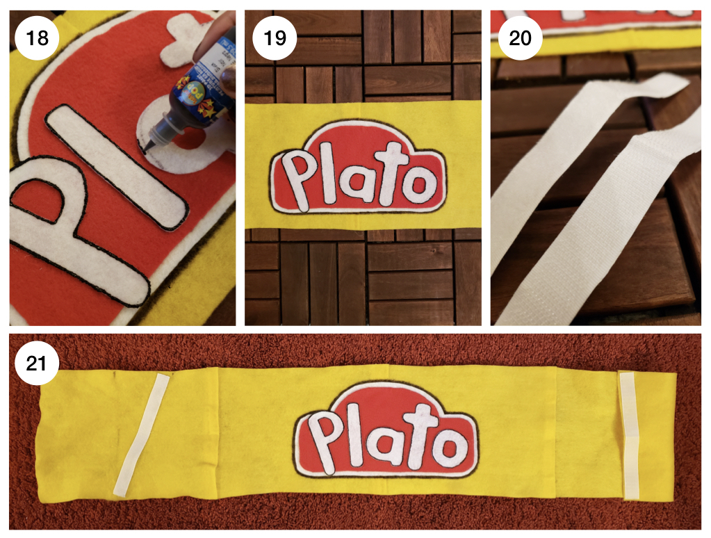 - Wrap the yellow felt around your waist, with the Sharpie mark where you are going to glue the Velcro, and glue on the Velcro. I found out that it’s better to attach the Velcro diagonally because of the shape of the body (see picture #21). If you don’t do this, the top part will be too big.