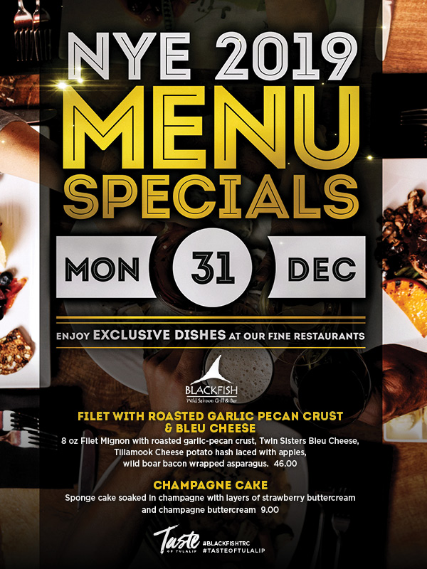 For ringing in the New Year, Chef David Buchanan has created a special menu of an 8-ounce Filet Mignon coated with a roasted garlic-pecan crust and topped with Twin Sisters Bleu Cheese alongside his Tillamook cheese potato hash laced with apples and wild boar bacon wrapped asparagus for $46.