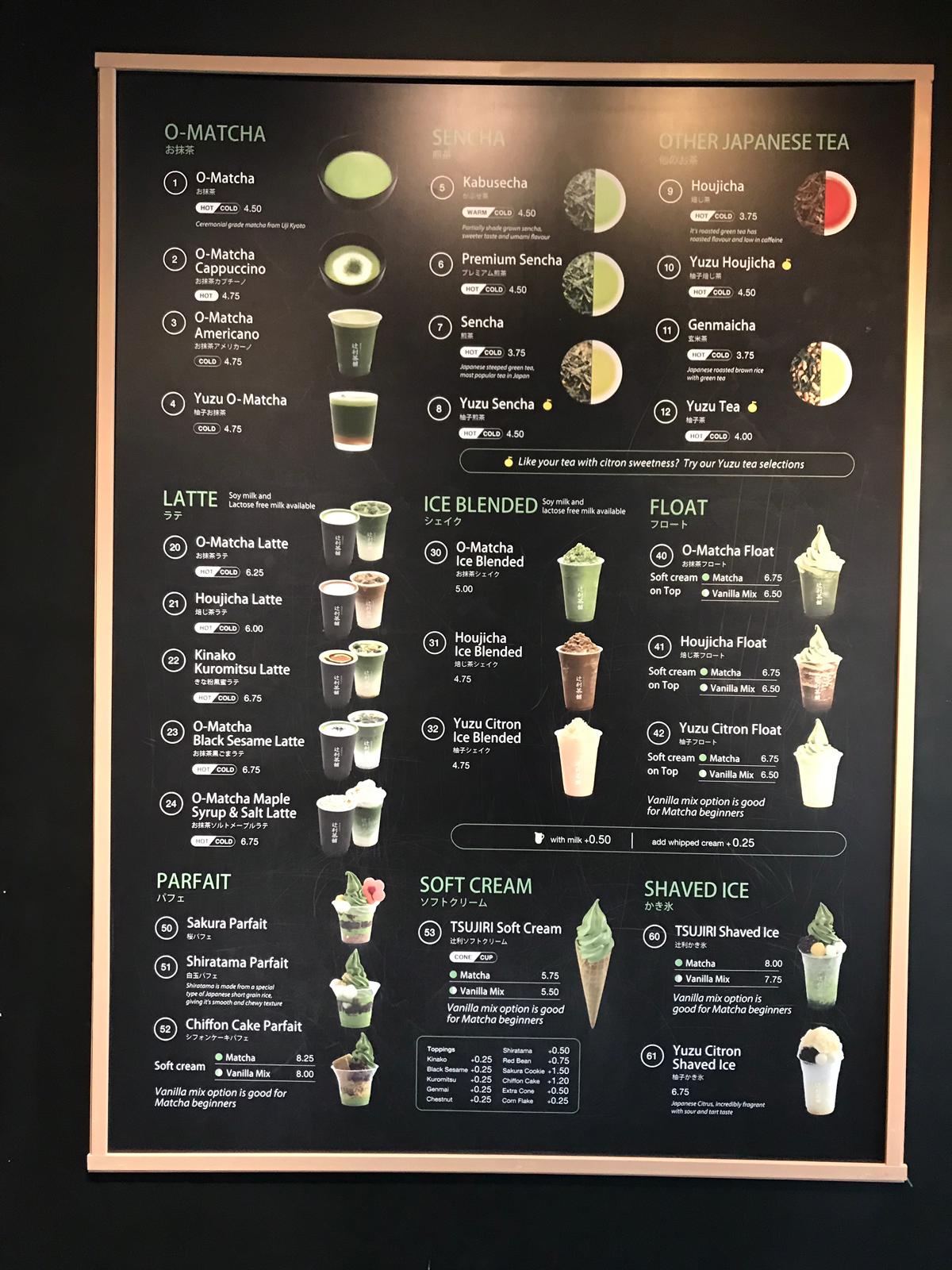 If you haven’t heard of Tsujiri before, the company is a long withstanding brand in Japan, famous for its matcha green tea. Tsujiri started off 155 years ago specializing in producing its own green tea and opening its own tea shops in Kyoto. It has now grown to be a global brand with one of the world’s best green tea desserts and teas. Tsujiri has finally made its way to the West Coast and is about to open any day now in Richmond, BC. However, on this visit to Edmonton, I had the fortune of finding Tsujiri here, no line ups and lots of items to choose from their menu.