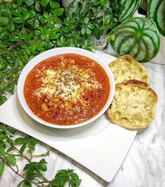 I’m always searching for new ways to fill my cravings for delicious meals while dieting which is hard for me because I’m not a big fan of vegetables. However, I found this amazing “20-Minute Healthy Tomato Bisque Soup” recipe by Fit Foodie Finds (link: https://fitfoodiefinds.com/20-minute-healthy-tomato-bisque-soup/). The best part is that I could eat so much of it without feeling guilty and I could add parmesan cheese and bread too! I modified the recipe to my likings (see below).