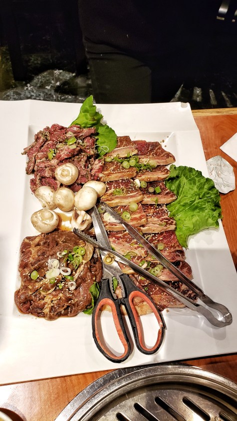 There were quite a few selections from the menu. They had some appetizers, soups, bbq meats, specials dishes, combos, and alcoholic and non-alcoholic drinks. Since we were at a Korean barbecue restaurant, of course, I ordered from the BBQ section! At first we were going to order Family for 4 combo ($97.99) from the Beef & Chicken Combo menu which includes green salad, spicy soft tofu or soybean paste soup, 4 steamed rice, bulgogi (marinated sliced beef), neukgansal jumoolluk (seasoned rib finger), dak bulgogi (marinated chicken), yangnyeomu-galbi (marinated sliced ribs), and LA galbi (marinated beef short ribs). However, the waiter said that the portions in the combos are smaller and that is why it’s cheaper than the regular BBQ menu.