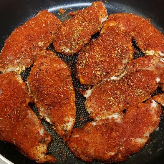 - Season chicken breast with the cajun spice. Be generous! Smother the chicken with a lot of cajun spice.