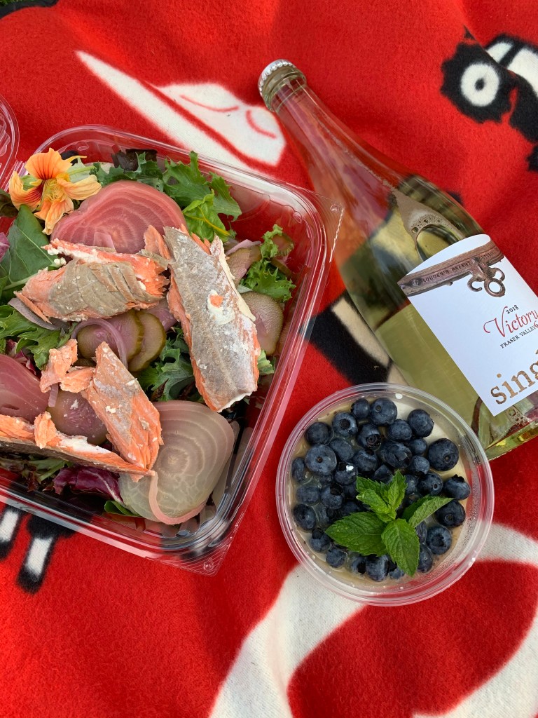 We headed over to Singletree Winery – a lovely 67-acre working farm and vineyard just a15-minute drive from our hotel. We had tickets to the Sun and Soil Concert series featuring Ben Contrill- our tickets included a glass of delicious wine, and a picnic basket curated by chef Adrian Beaty with ingredients sourced from local farms. We opted for a wild salmon salad and for dessert, a panna cotta topped with fresh BC Blueberries.